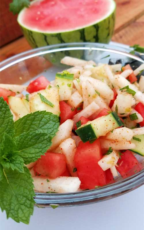 - In a bowl mix together Jicama, watermelon and cucumber.