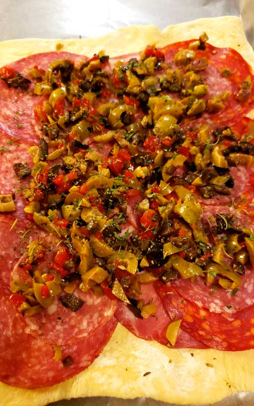 - You’ll want to leave a border when arranging the meat slices, olive salad and cheese on the puff pastry so everything stays inside.